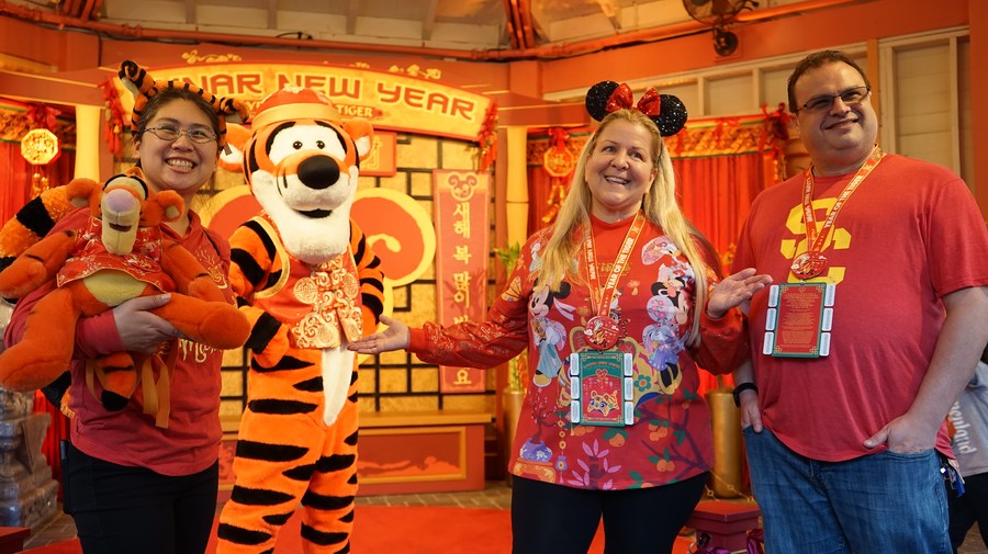 Visitors pose for photos with the cartoon character Tigger during the Lunar New Year celebrations at Disney's California Adventure Park in Anaheim, the United States, on Jan. 21, 2022. (Photo by Zeng Hui/Xinhua)