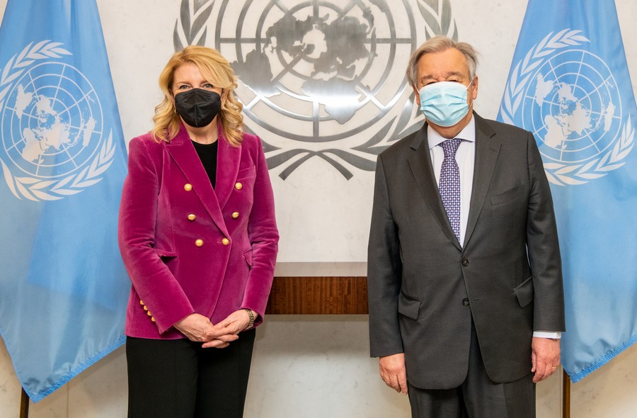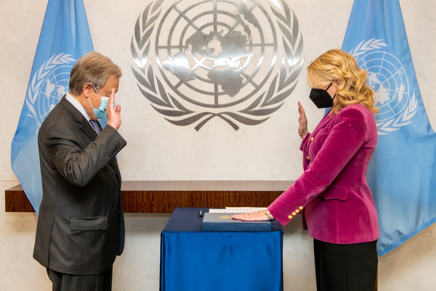 UN Secretary-General Antonio Guterres (L) swears in Catherine Russell of the United States as the new executive director of the UN Children's Fund at the UN headquarters in New York, on Feb. 1, 2022. (Mark Garten/UN Photo/Handout via Xinhua)
