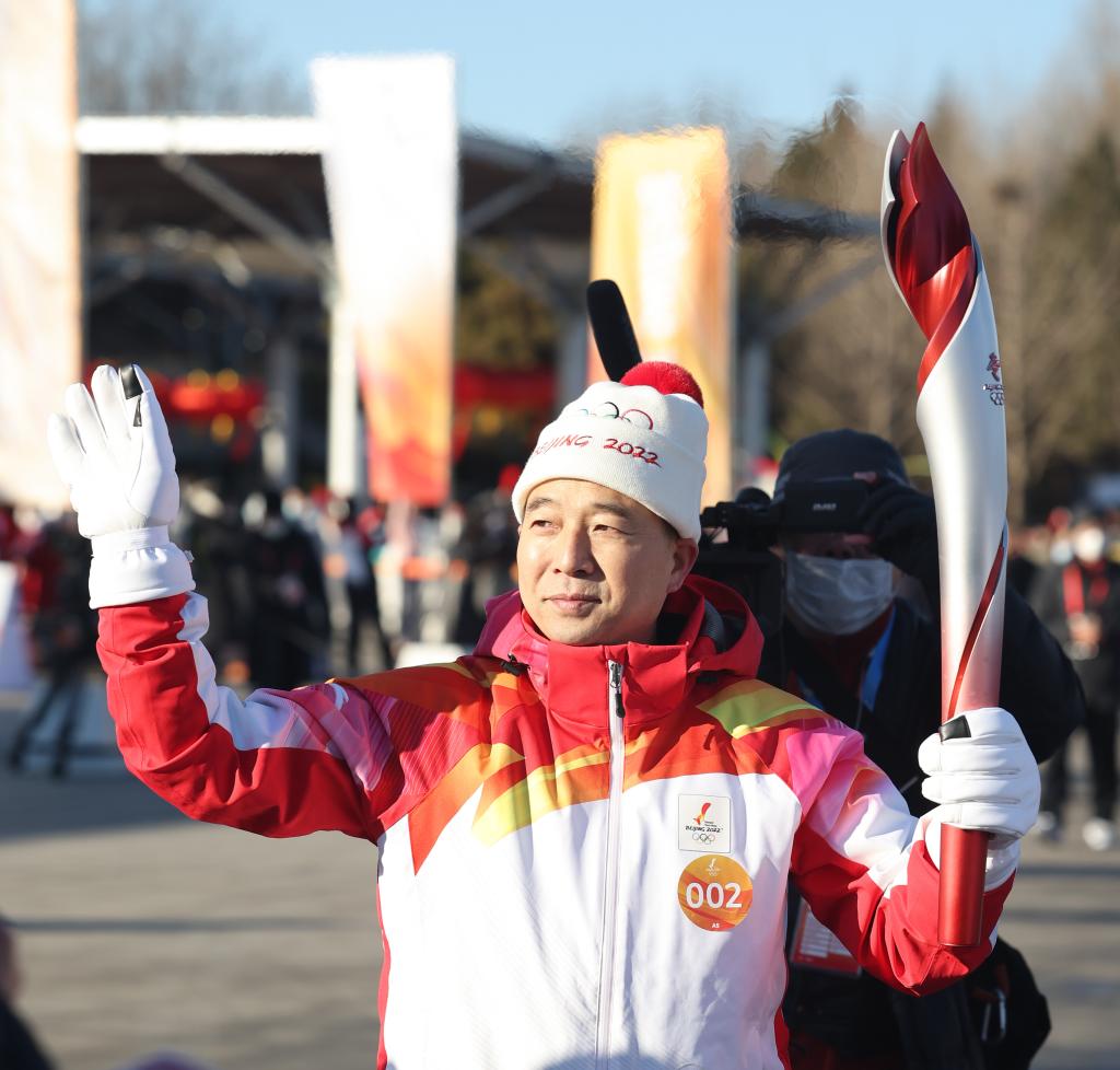 China's first winter sports world champion Luo Zhihuan runs with the torch during the Beijing 2022 Olympic Torch Relay at the Olympic Forest Park in Beijing, capital of China, Feb. 2, 2022. (Xinhua/Chen Zhonghao)