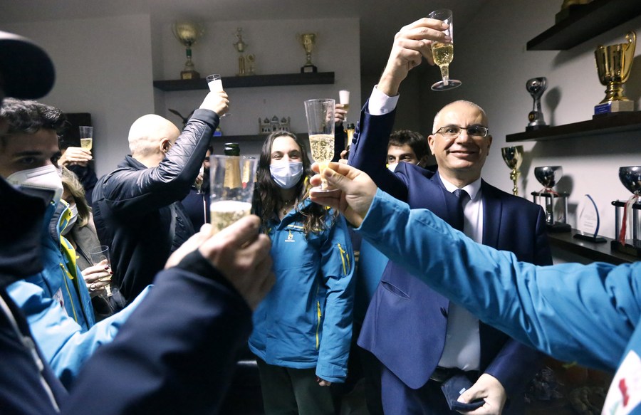President of the Lebanese Ski Federation Freddy Keyrouz (1st R) and players Cesar Arnouk (1st L), Manon Owaiss (3rd R) celebrate after a press conference on the eve of three Lebanese skiers' departure to China for the Beijing Winter Olympics, in Beirut, Lebanon, on Jan. 31, 2022. (Xinhua/Bilal Jawich)