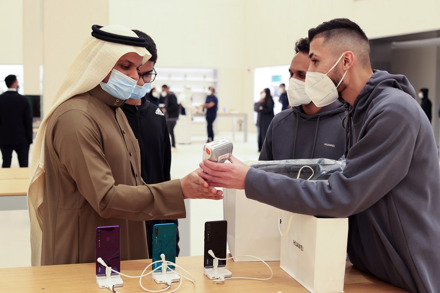 Customers buy smart phones at Chinese tech giant Huawei's largest overseas store on its opening day in Riyadh, Saudi Arabia, Feb. 2, 2022. (Xinhua/Wang Haizhou)