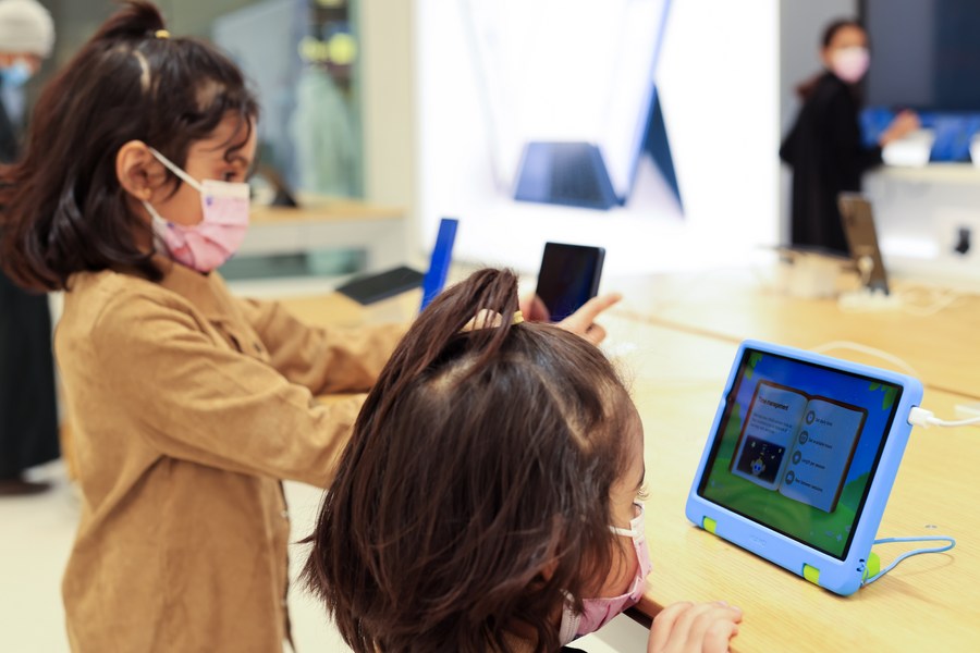 Kids try smart products at Huawei's largest overseas store on its opening day in Riyadh, Saudi Arabia, Feb. 2, 2022. (Xinhua/Wang Haizhou)