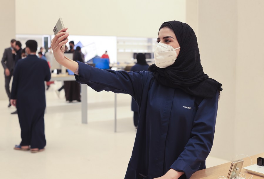 A shop assistant takes a selfie at Huawei's largest overseas store on its opening day in Riyadh, Saudi Arabia, Feb. 2, 2022. (Xinhua/Wang Haizhou) ■