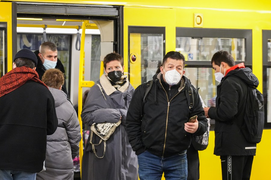 Passengers wearing face masks get off a subway train in Berlin, Germany, on Jan. 21, 2022. (Photo by Stefan Zeitz/Xinhua)