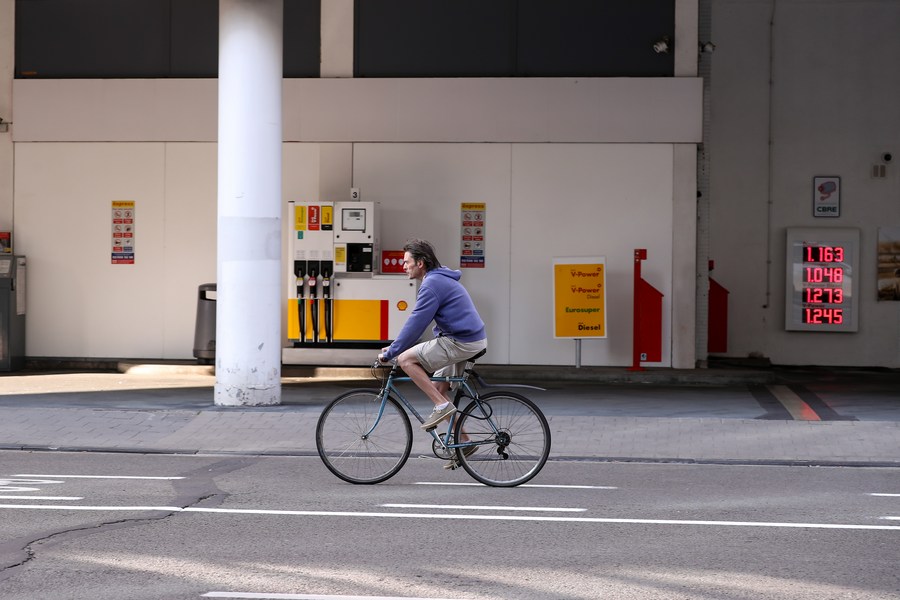 A man rides past a gas station in Brussels, Belgium, April 9, 2020. (Xinhua/Zhang Cheng)