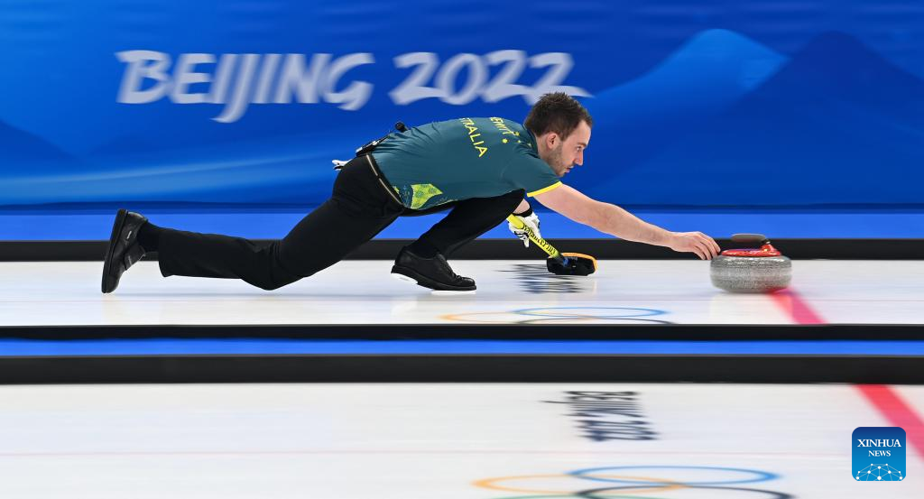 Dean Hewitt of Australia competes during the curling mixed doubles round robin session of the Beijing 2022 Winter Olympics between China and Australia at the National Aquatics center in Beijing, China, Feb. 3, 2022. (Xinhua/Huang Xiaobang)