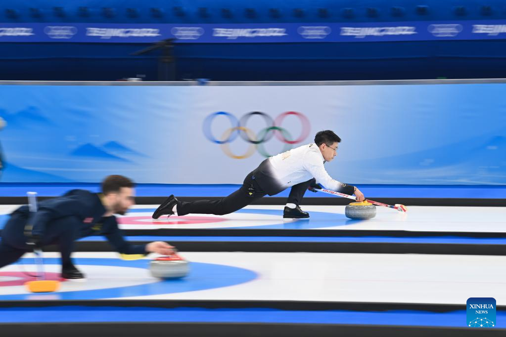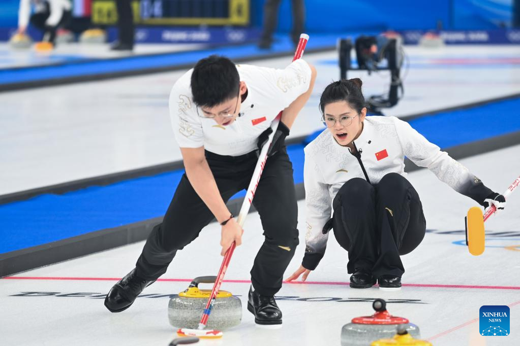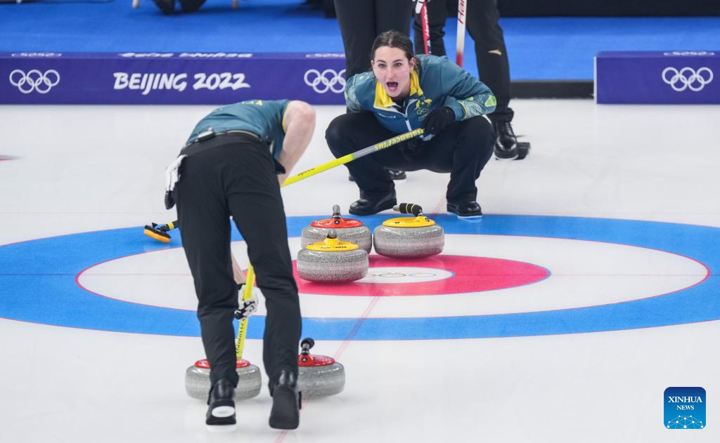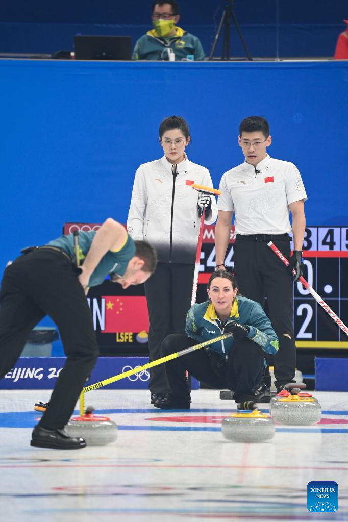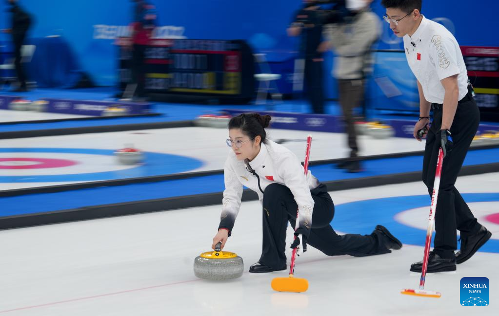 Photo shows the curling mixed doubles round robin session of the Beijing 2022 Winter Olympics between China and Australia at the National Aquatics center in Beijing, China, Feb. 3, 2022. (Xinhua/Zhou Mi)