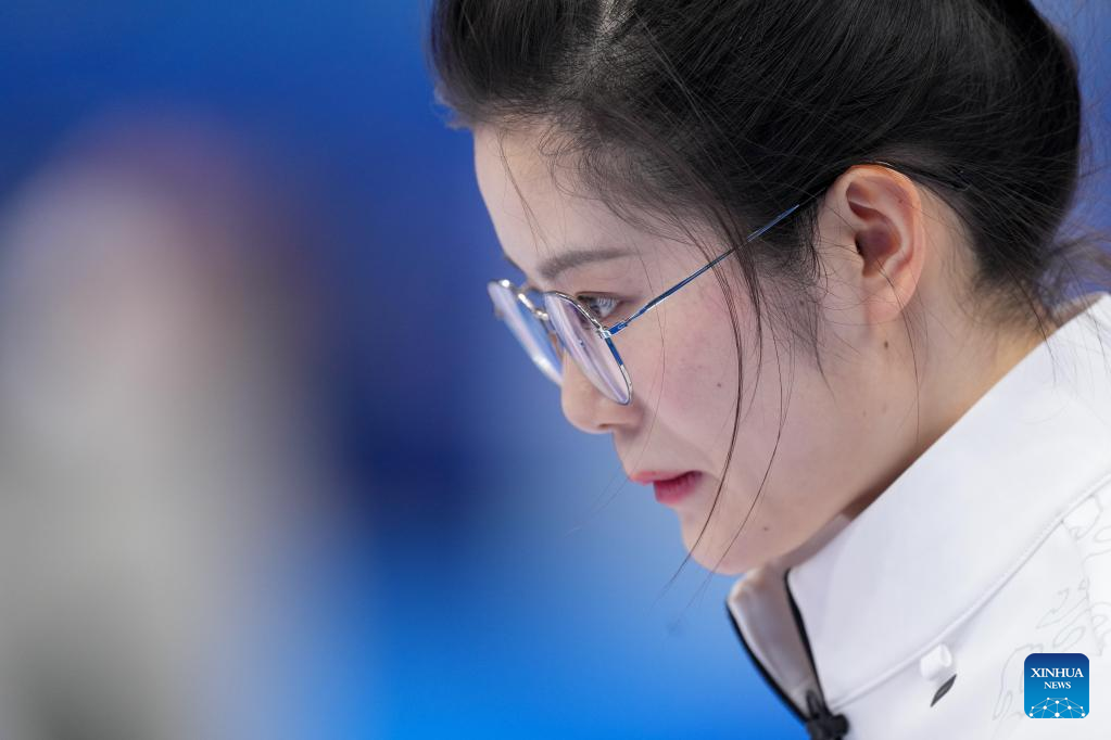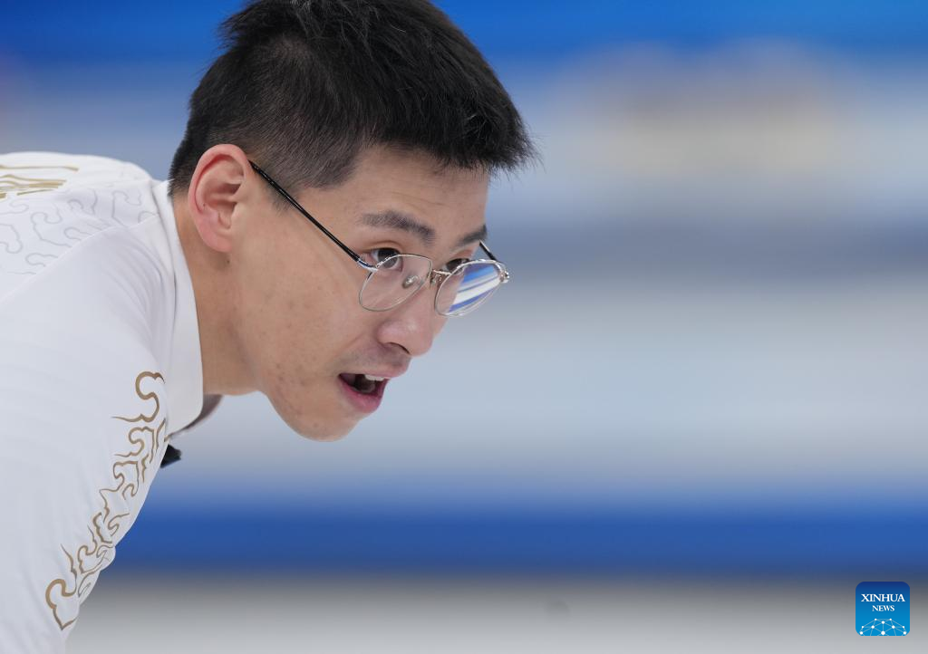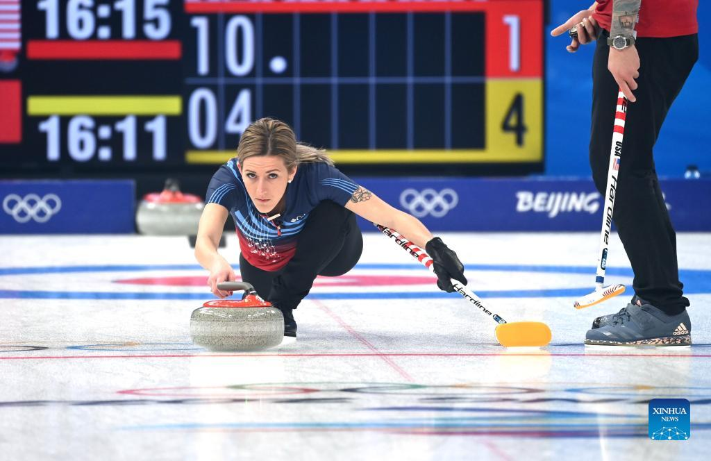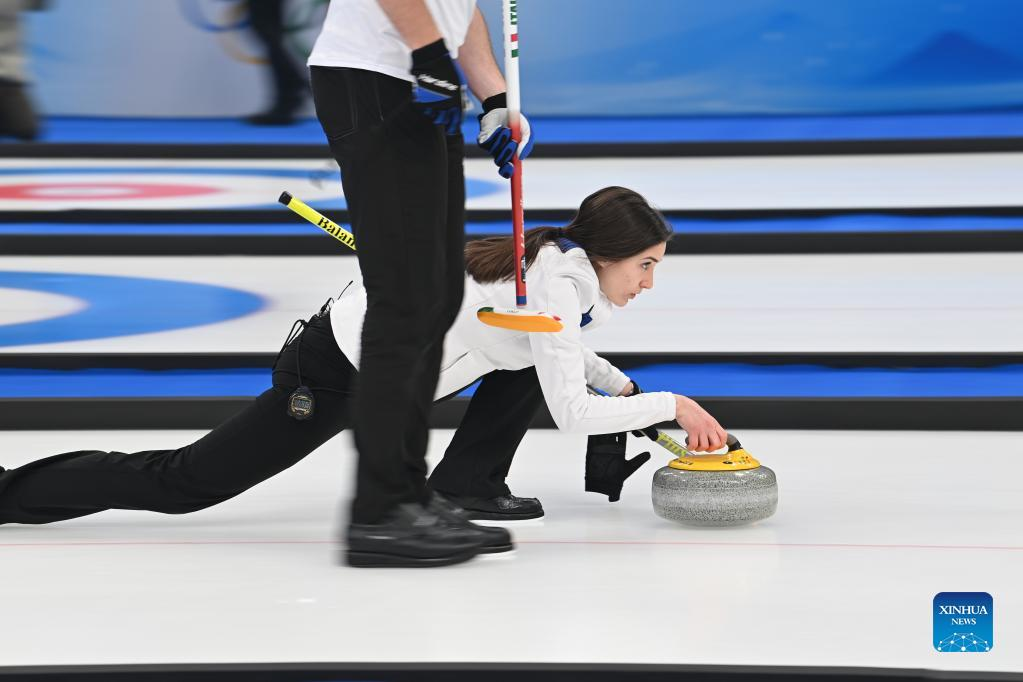 Photo shows the curling mixed doubles round robin session of the Beijing 2022 Winter Olympics between China and Australia at the National Aquatics center in Beijing, China, Feb. 3, 2022. (Xinhua/Zhou Mi)