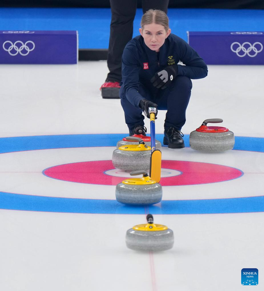 Almida De Val of Sweden competes during the curling mixed doubles round robin event of the Beijing 2022 Winter Olympic Games between Sweden and Czech Republic at National Aquatics Centre in Beijing, China, Feb. 3, 2022. (Xinhua/Zhou Mi)