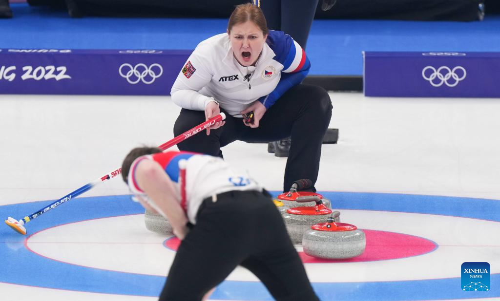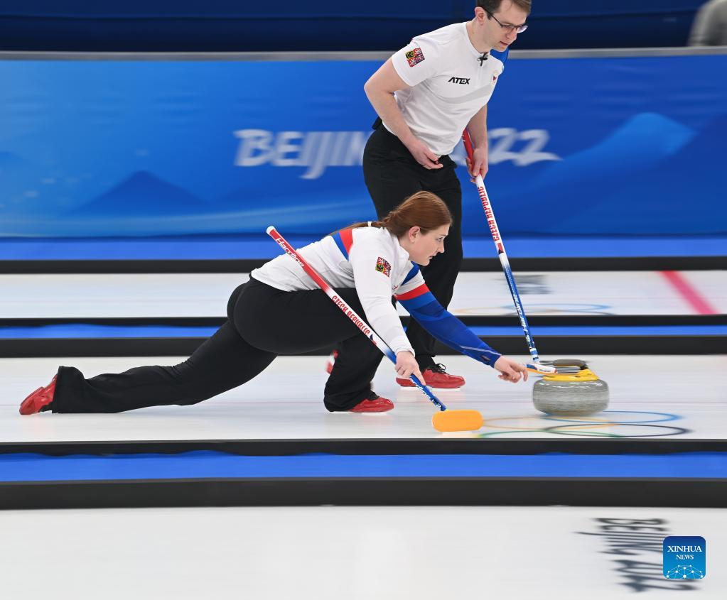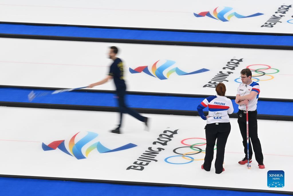 Zuzana Paulova (top) of Czech Republic competes during the curling mixed doubles round robin event of the Beijing 2022 Winter Olympic Games between Sweden and Czech Republic at National Aquatics Centre in Beijing, China, Feb. 3, 2022. (Xinhua/Zhou Mi)