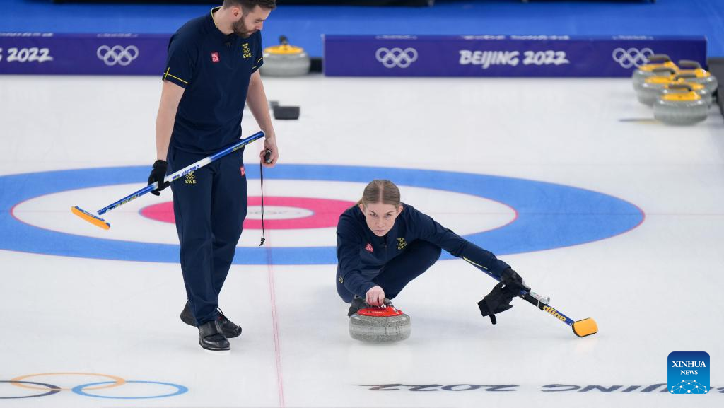 Almida De Val (R) of Sweden and her teammate Oskar Eriksson compete during the curling mixed doubles round robin event of the Beijing 2022 Winter Olympic Games between Sweden and Czech Republic at National Aquatics Centre in Beijing, China, Feb. 3, 2022. (Xinhua/Zhou Mi)