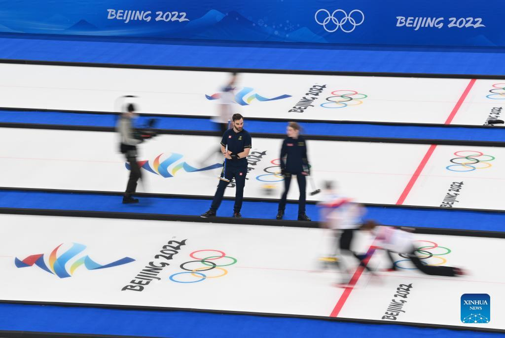 Athletes compete during the curling mixed doubles round robin event of the Beijing 2022 Winter Olympic Games between Sweden and Czech Republic at National Aquatics Centre in Beijing, China, Feb. 3, 2022. (Xinhua/Huang Xiaobang)