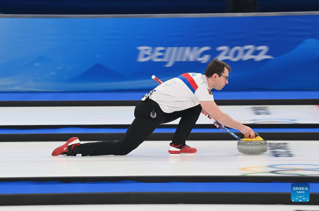 Tomas Paul of the Czech Republic competes during the curling mixed doubles round robin event of the Beijing 2022 Winter Olympics between Sweden and Czech Republic at National Aquatics Centre in Beijing, China, Feb. 3, 2022. (Xinhua/Huang Xiaobang)