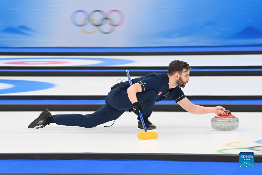 Oskar Eantenberg of Sweden competes during the curling mixed doubles round robin event of the Beijing 2022 Winter Olympics between Sweden and Czech Republic at National Aquatics Centre in Beijing, China, Feb. 3, 2022. (Xinhua/Huang Xiaobang)