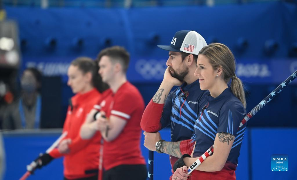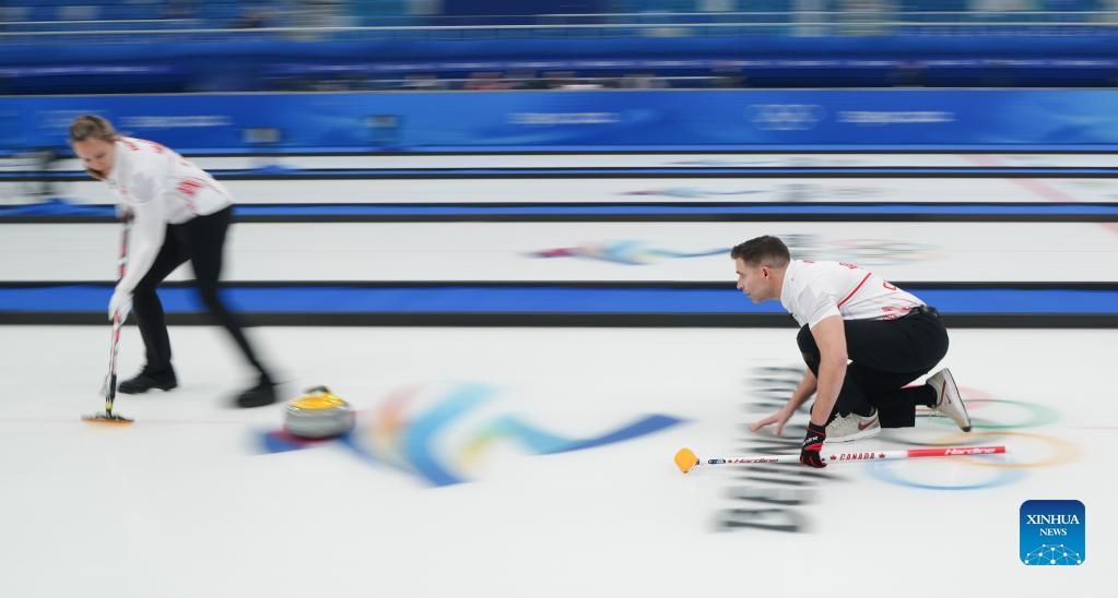 John Morris (R) of Canada and his teammate Rachel Homan competes during the Beijing 2022 Winter Olympic Games between Great Britain and Canada at National Aquatics Centre in Beijing, China, Feb. 3, 2022. (Xinhua/Zhou Mi)