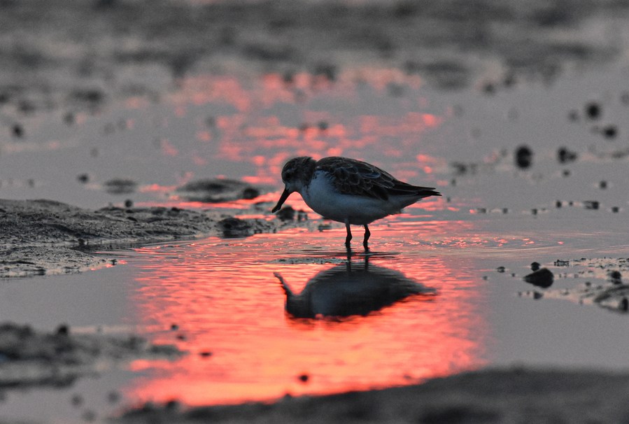 A spoon-billed sandpiper is seen at a wetland in Danzhou City, south China's Hainan Province. (Xinhua/Pu Xiaoxu)