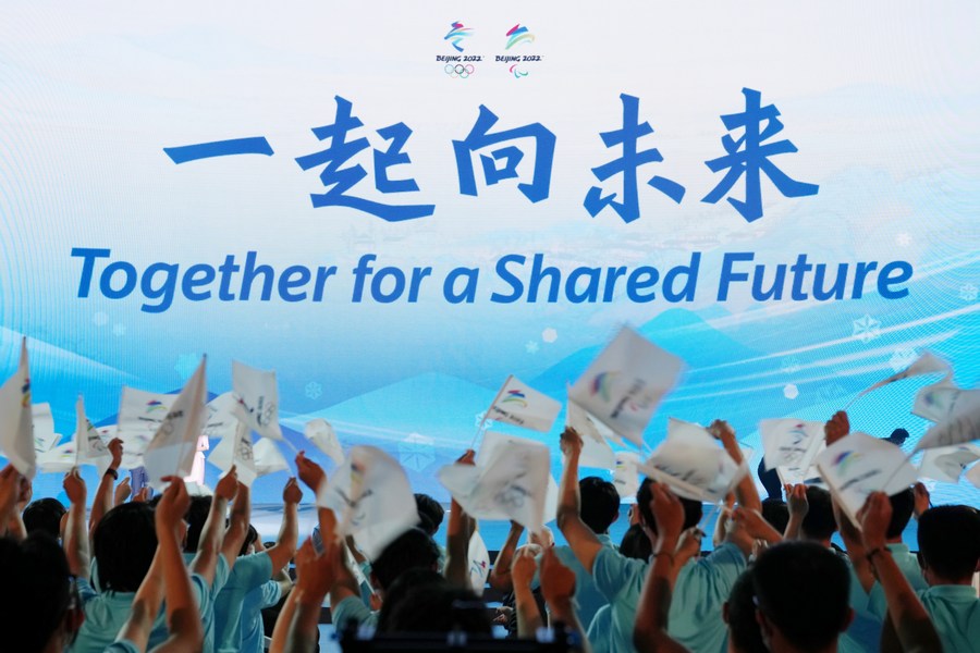Photo taken on Sept. 17, 2021 shows the unveiling ceremony of the official motto for Beijing 2022 "Together for a Shared Future" in Beijing, capital of China. (Xinhua/Ju Huanzong)