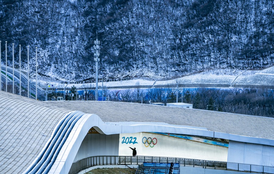 An ice maker sprays water over a sub-glacial Olympic rings on the track at the Yanqing National Sliding Center ahead of the 2022 Winter Olympics in the Yanqing district of Beijing, China, Jan. 28, 2022. (Xinhua/Jiang Wenyao)