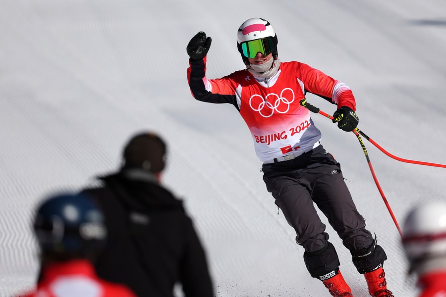 A staff member celebrates after passing the finish line during a whole-process rehearsal at the National Alpine Skiing Center in Yanqing District, Beijing, capital of China, Feb. 1, 2022. (Xinhua/Chen Bin)