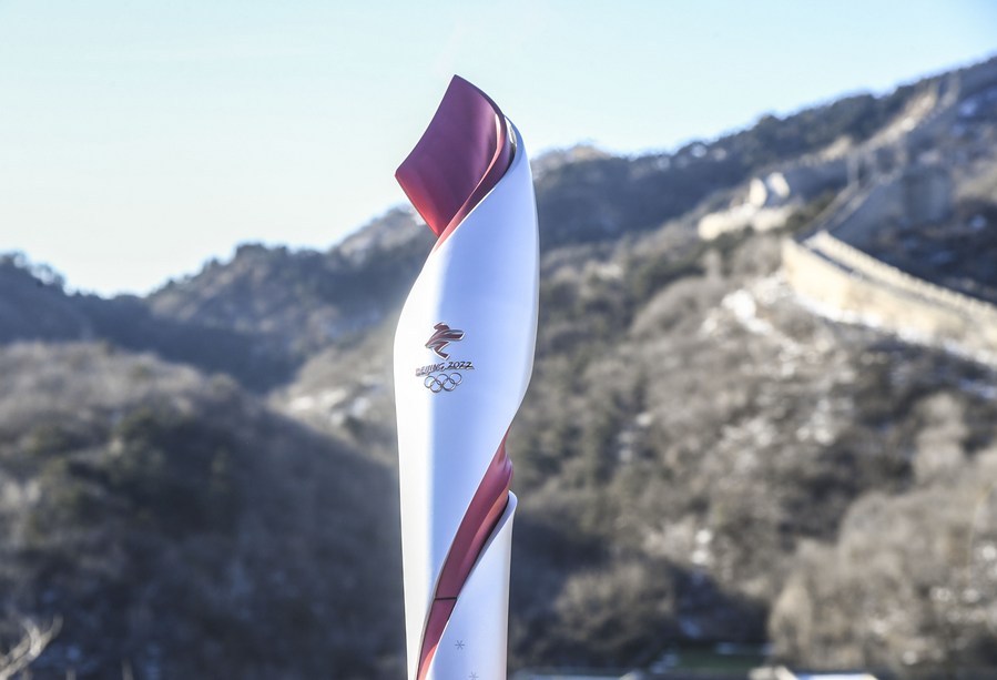 A torch is pictured during the Beijing 2022 Olympic Torch Relay at the Badaling section of the Great Wall in Yanqing district of Beijing, Feb. 3, 2022. (Xinhua/Ren Chao)