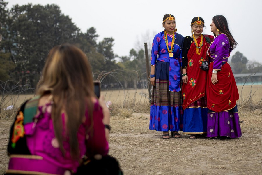 Nepalese Tamang girls in traditional attire take photos during the celebration of Sonam Lhosar festival in Kathmandu, Nepal, Feb. 2, 2022. (Photo by Sulav Shrestha/Xinhua)
