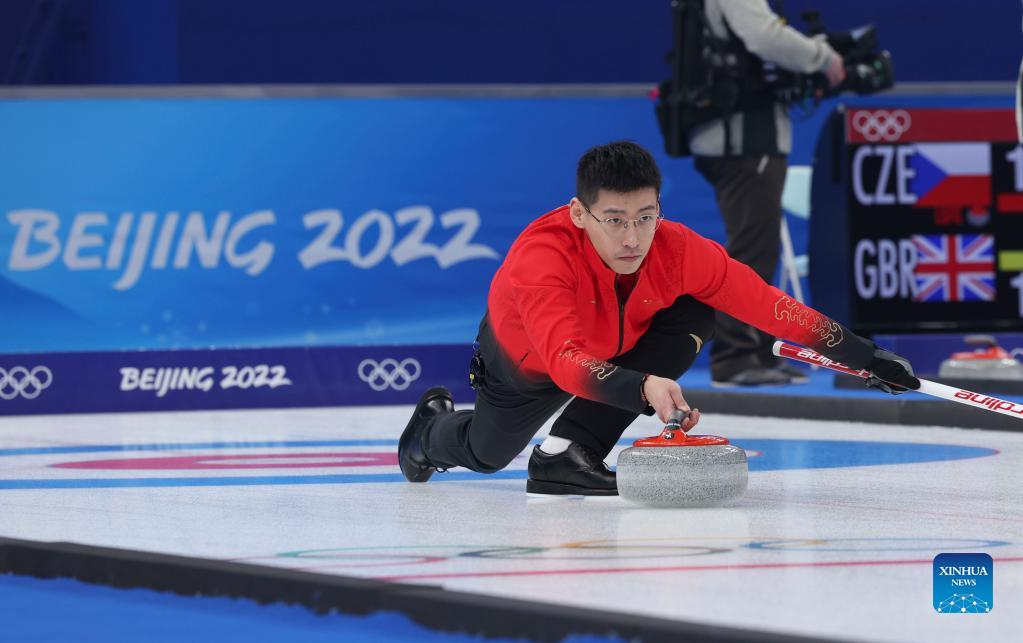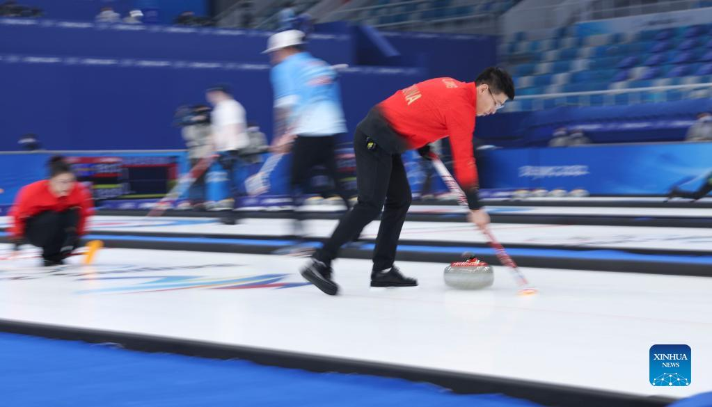 Ling Zhi of China competes during the curling mixed doubles round robin event of the Beijing 2022 Winter Olympics between China and the United States at National Aquatics Centre in Beijing, capital of China, Feb. 5, 2022. (Xinhua/Wang Jingqiang)
