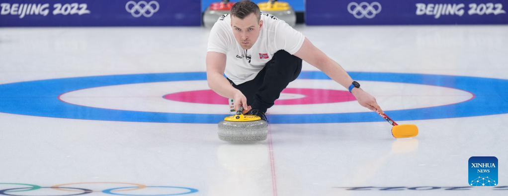 Magnus Nedregotten of Norway competes during the curling mixed doubles round robin event of the Beijing 2022 Winter Olympics between Norway and Australia at National Aquatics Centre in Beijing, capital of China, Feb. 5, 2022. (Xinhua/Zhou Mi)