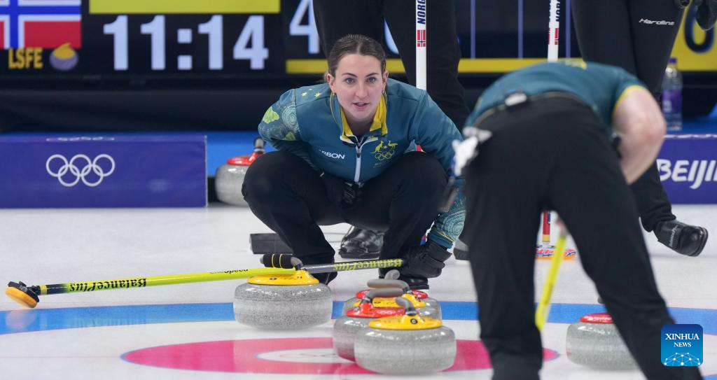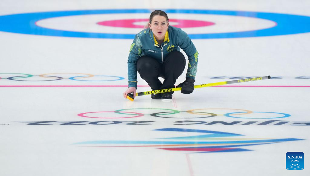 Tahli Gill of Australia competes during the curling mixed doubles round robin event of the Beijing 2022 Winter Olympics between Norway and Australia at National Aquatics Centre in Beijing, capital of China, Feb. 5, 2022. (Xinhua/Zhou Mi)