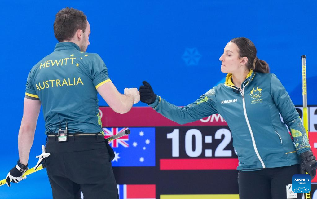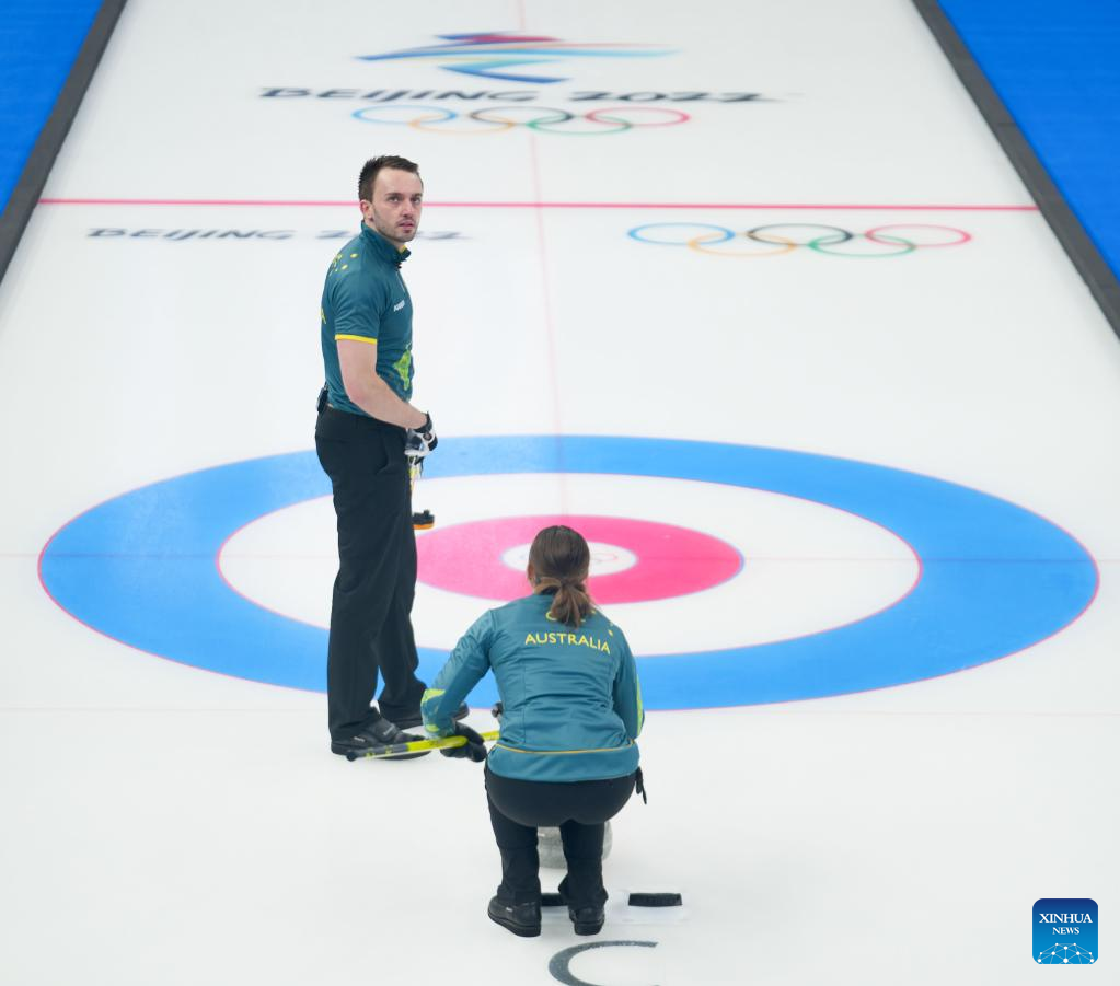 Dean Hewitt (L) and Tahli Gill of Australia compete during the curling mixed doubles round robin event of the Beijing 2022 Winter Olympics between Norway and Australia at National Aquatics Centre in Beijing, capital of China, Feb. 5, 2022. (Xinhua/Zhou Mi)