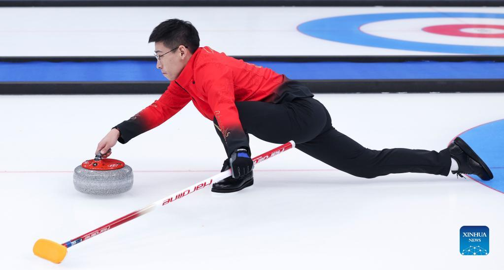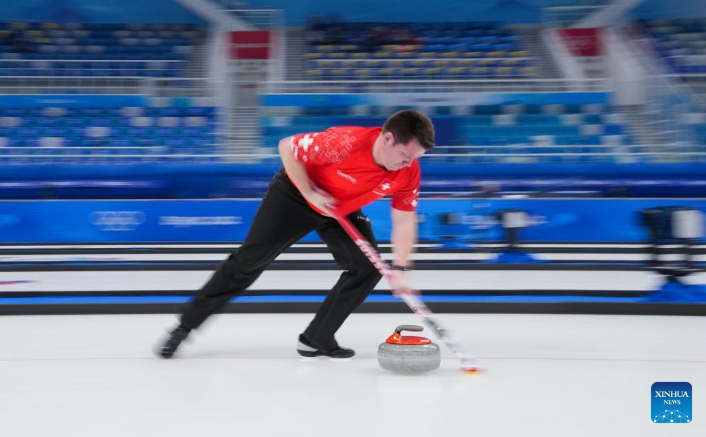Martin Rios of Switzerland competes during the curling mixed doubles round robin event of the Beijing 2022 Winter Olympics between Sweden and Switzerland at National Aquatics Centre in Beijing, capital of China, Feb. 5, 2022. (Xinhua/Zhou Mi)