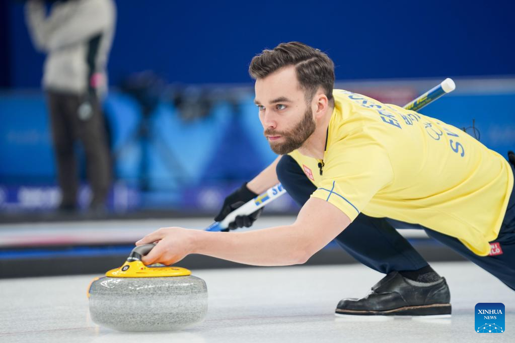 Oskar Eriksson of Sweden competes during the curling mixed doubles round robin event of the Beijing 2022 Winter Olympics between Sweden and Switzerland at National Aquatics Centre in Beijing, capital of China, Feb. 5, 2022. (Xinhua/Zhou Mi)