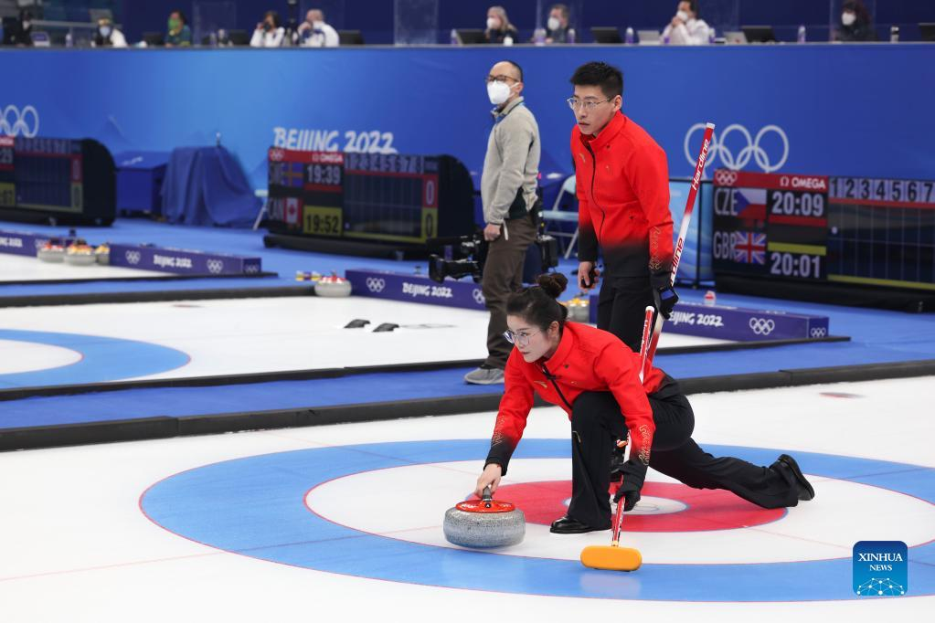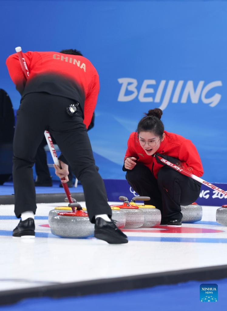 Fan Suyuan (R) and Ling Zhi of China compete during the curling mixed doubles round robin event of the Beijing 2022 Winter Olympics between China and the United States at National Aquatics Centre in Beijing, capital of China, Feb. 5, 2022. (Xinhua/Wang Jingqiang)