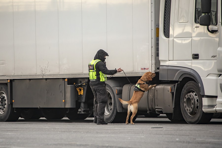 A customs dog inspects a truck coming from Britain at the Calais Port in France, Jan. 1, 2021. (Photo by Sebastien Courdji/Xinhua)