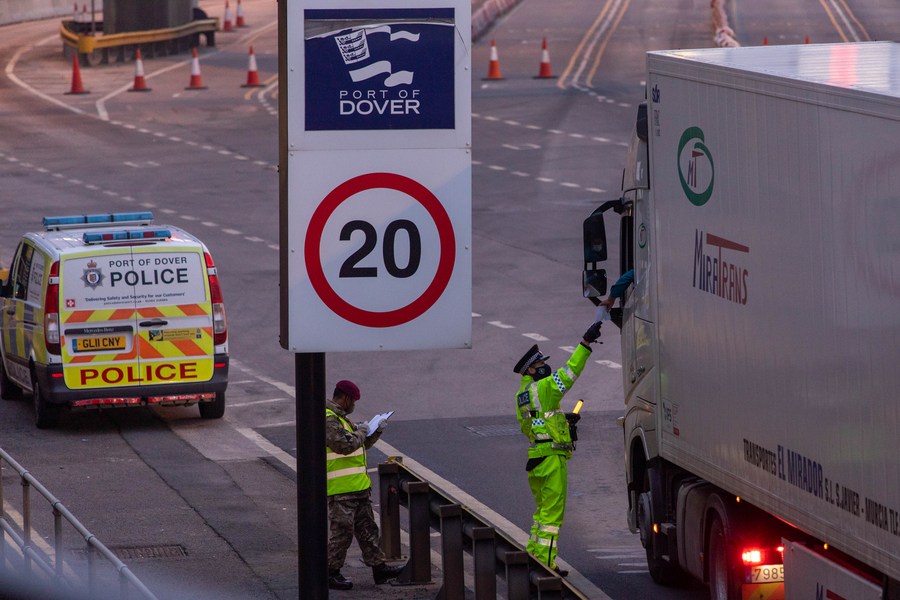 Police officers check the documents of lorry drivers at the Port of Dover in Dover, Britain, on Dec. 31, 2020. (Photo by Tim Ireland/Xinhua)