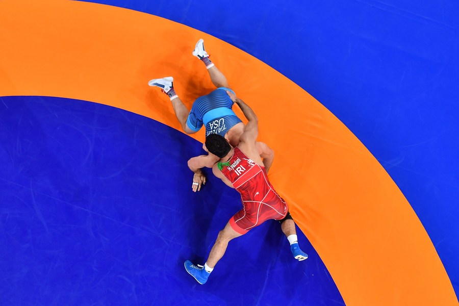 David Morris Taylor III (top) of the United States competes against Hassan Yazdanicharati of Iran during the wrestling men's freestyle 86kg final at the Tokyo 2020 Olympic Games in Chiba, Japan, Aug. 5, 2021. (Xinhua/Chen Yichen)