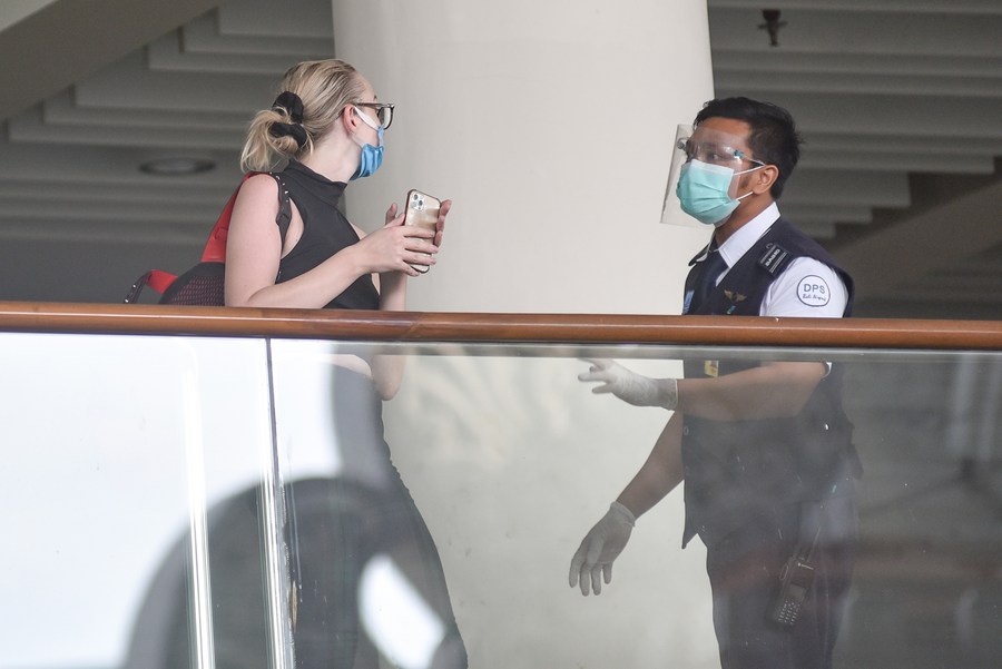 An official greets an international traveler at Ngurah Rai International Airport in Bali, Indonesia, Feb. 3, 2022. (Photo by Bisinglasi/Xinhua)