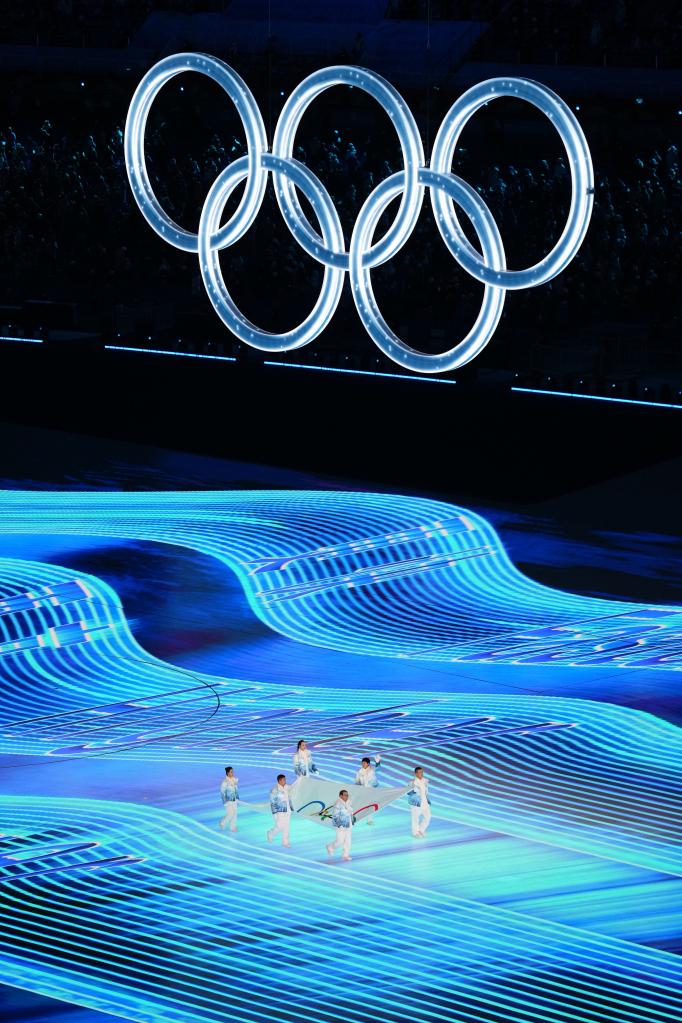 Flag bearers carry the Olympic flag into the National Stadium during the opening ceremony of the Beijing 2022 Olympic Winter Games in Beijing, capital of China, Feb. 4, 2022. (Xinhua/Wang Yuguo)
