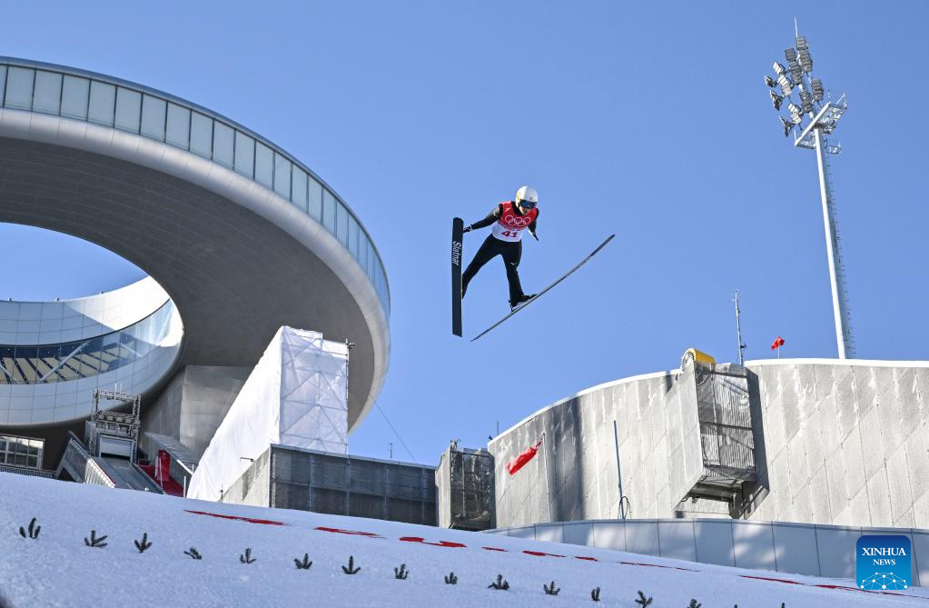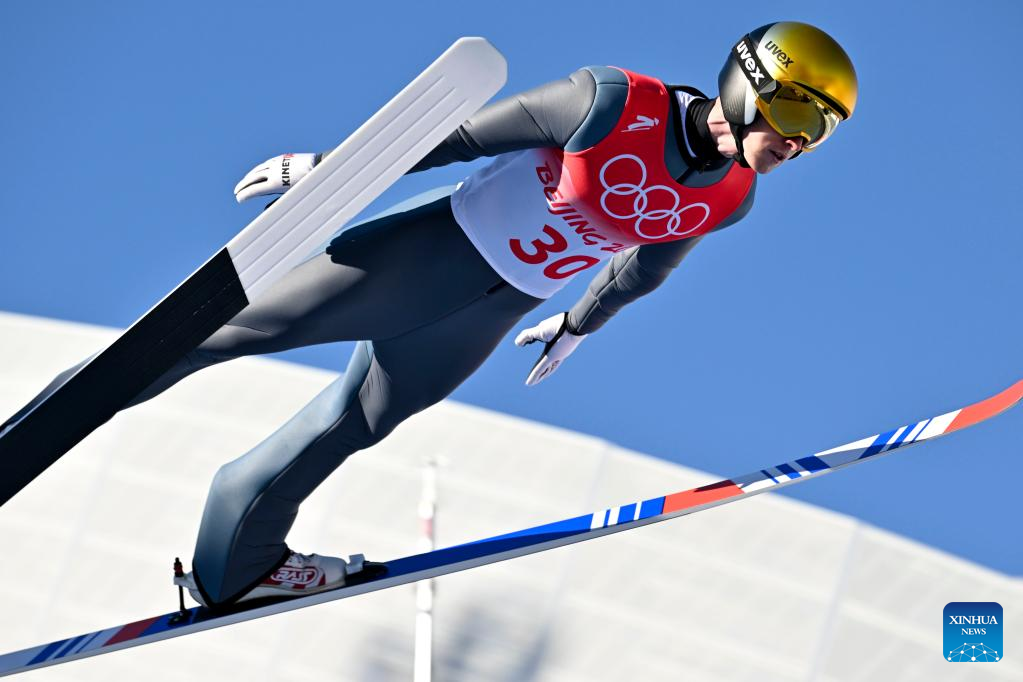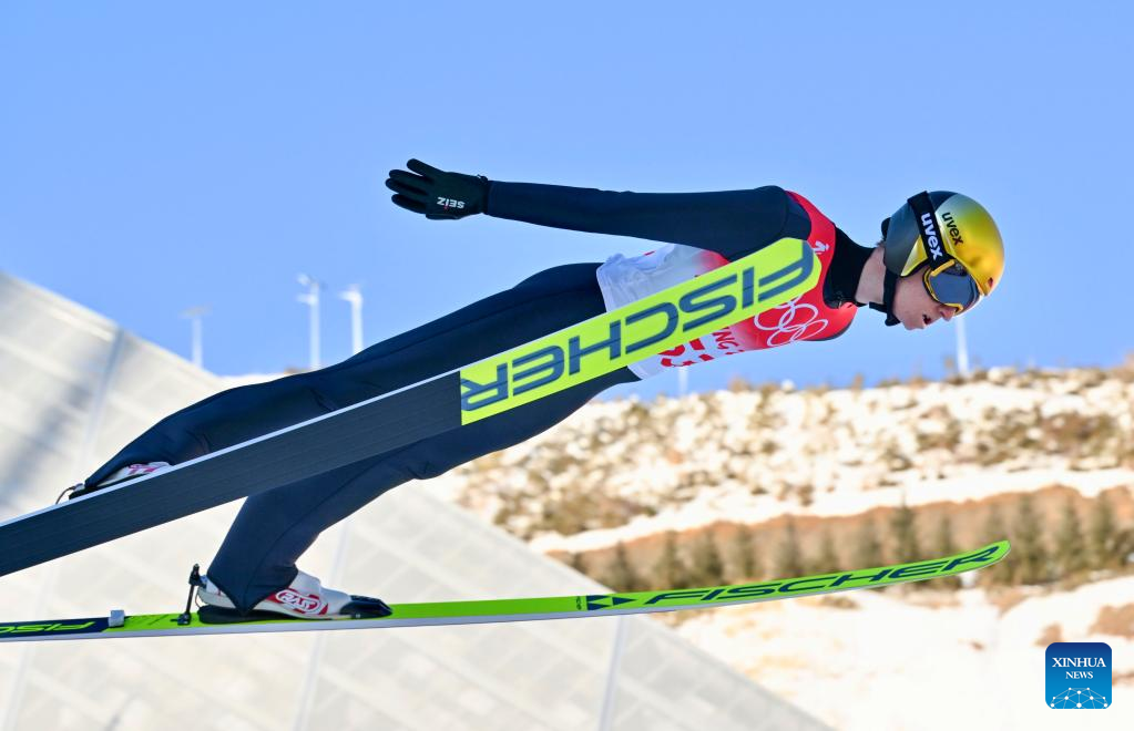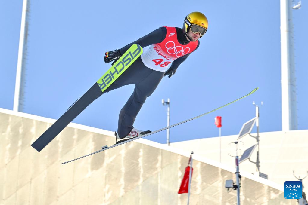 Karl Geiger of Germany competes during the Ski Jumping men's normal hill individual qualification at the National Ski Jumping Centre in Zhangjiakou, north China's Hebei Province, Feb. 5, 2022. (Xinhua/Jiang Kehong)