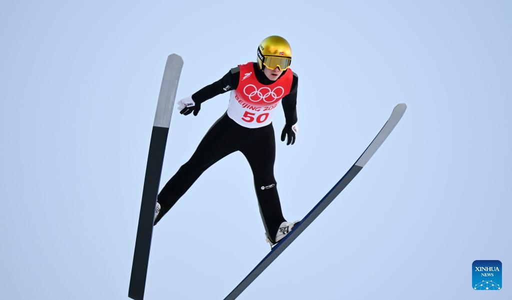 Marius Lindvik of Norway competes during the Ski Jumping men's normal hill individual qualification at the National Ski Jumping Centre in Zhangjiakou, north China's Hebei Province, Feb. 5, 2022. (Xinhua/Dai Tianfang)
