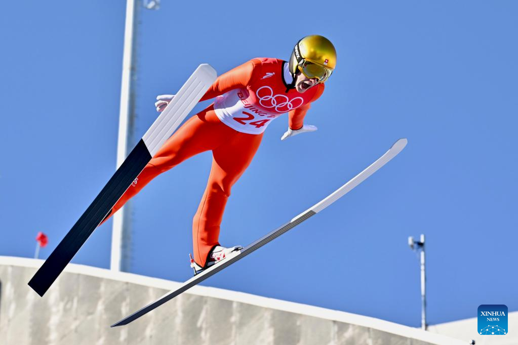 Dominik Peter of Switzerland competes during the Ski Jumping men's normal hill individual qualification at the National Ski Jumping Centre in Zhangjiakou, north China's Hebei Province, Feb. 5, 2022. (Xinhua/Jiang Kehong)