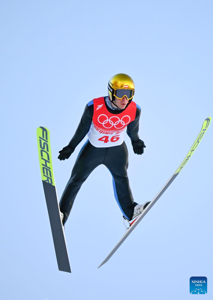Stefan Kraft of Austria competes during the Ski Jumping men's normal hill individual qualification at the National Ski Jumping Centre in Zhangjiakou, north China's Hebei Province, Feb. 5, 2022. (Xinhua/Dai Tianfang)