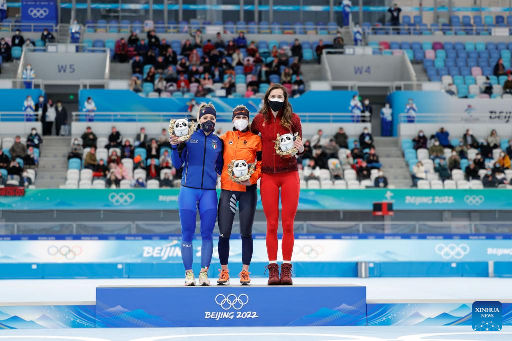 Gold medalist Irene Schouten (C) of the Netherlands, silver medalist Francesca Lollobrigida (1st L) of Italy, and bronze medalist Isabelle Weidemann of Canada pose for a photo during the flower ceremony of the women's 3,000m final of speed skating at the National Speed Skating Oval in Beijing, capital of China, Feb. 5, 2022. (Xinhua/Ding Xu)