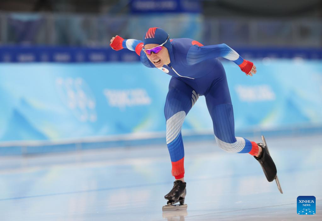 Evgeniia Lalenkova of the Russian Olympic Committee (ROC) competes during the women's 3,000m final of speed skating at the National Speed Skating Oval in Beijing, capital of China, Feb. 5, 2022. (Xinhua/Ding Xu)