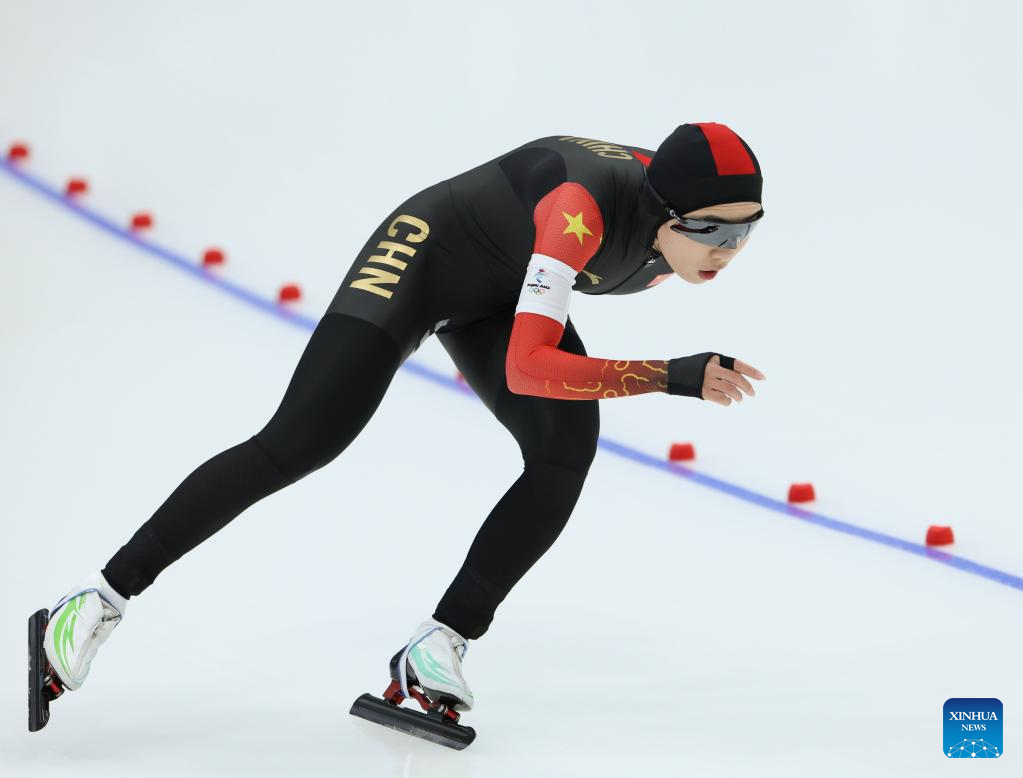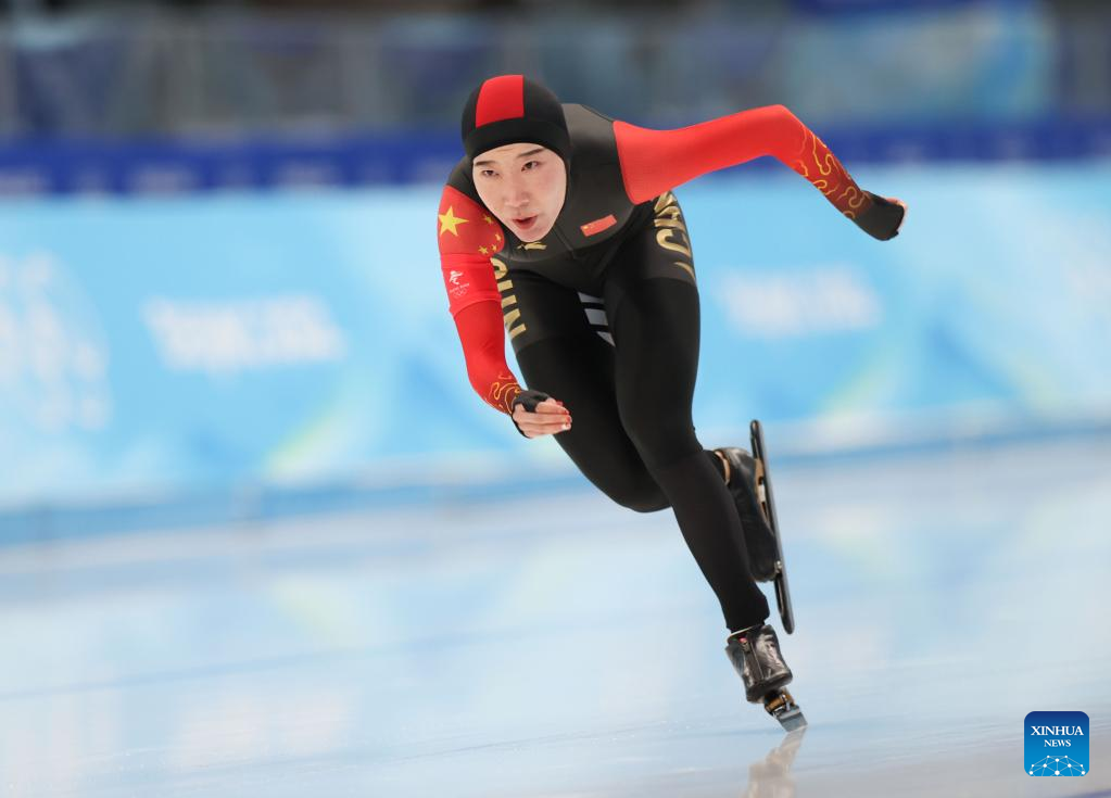 Han Mei of China competes during the women's 3,000m final of speed skating at the National Speed Skating Oval in Beijing, capital of China, Feb. 5, 2022. (Xinhua/Ding Xu)