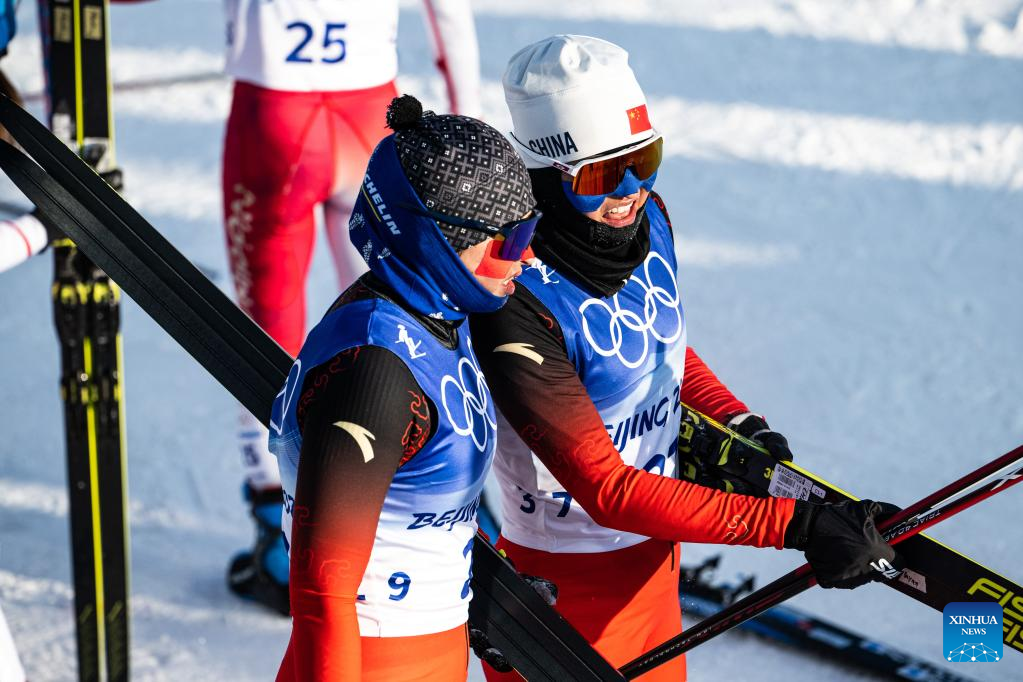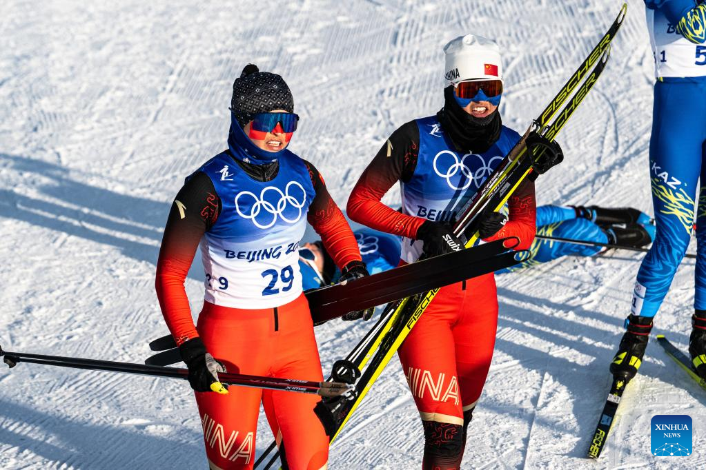 Dinigeer Yilamujiang (L) and Bayani Jialin of China leave after the Cross-Country Skiing Women's 7.5km + 7.5km Skiathlon at National Cross-Country Skiing Centre in Zhangjiakou, north China's Hebei Province, Feb. 5, 2022. (Xinhua/Xiao Yijiu)