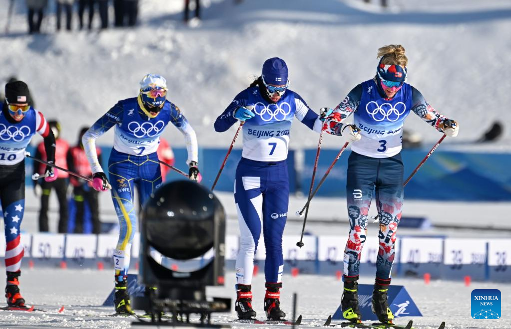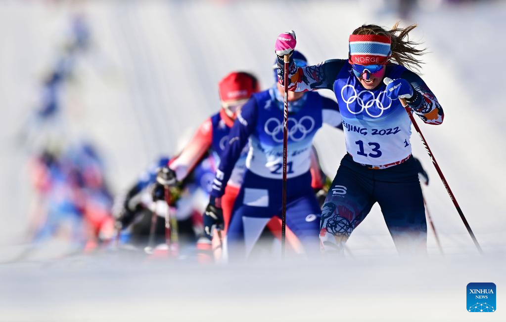 Helene Marie Fossesholm (1st R) of Norway competes during the Cross-Country Skiing Women's 7.5km + 7.5km Skiathlon at National Cross-Country Skiing Centre in Zhangjiakou, north China's Hebei Province, Feb. 5, 2022. (Xinhua/Zhang Hongxiang)