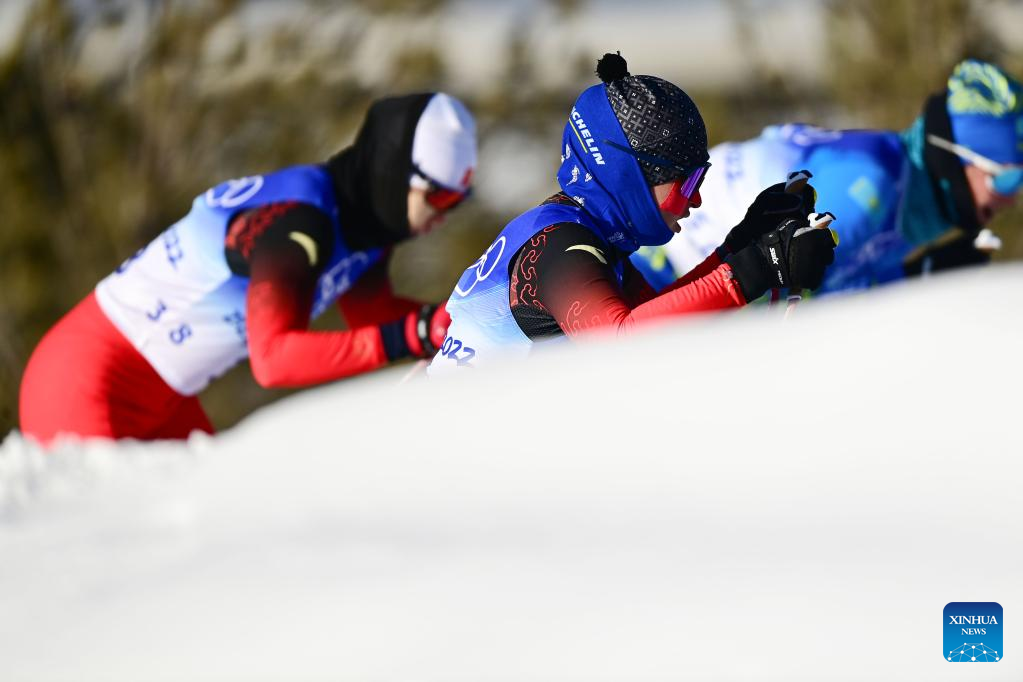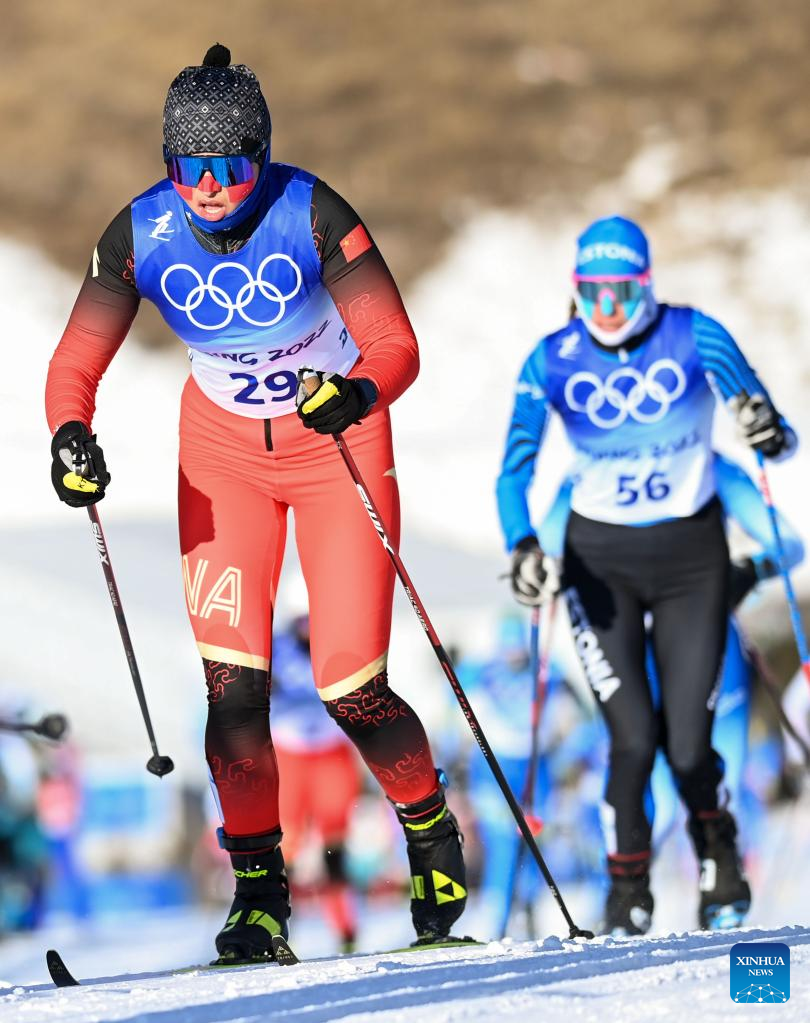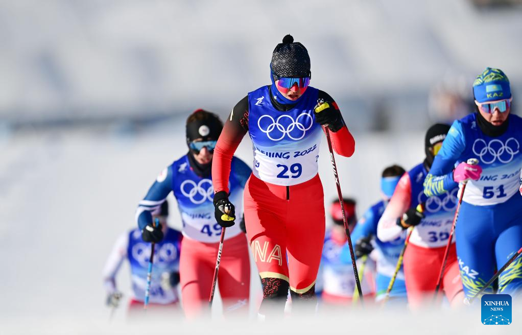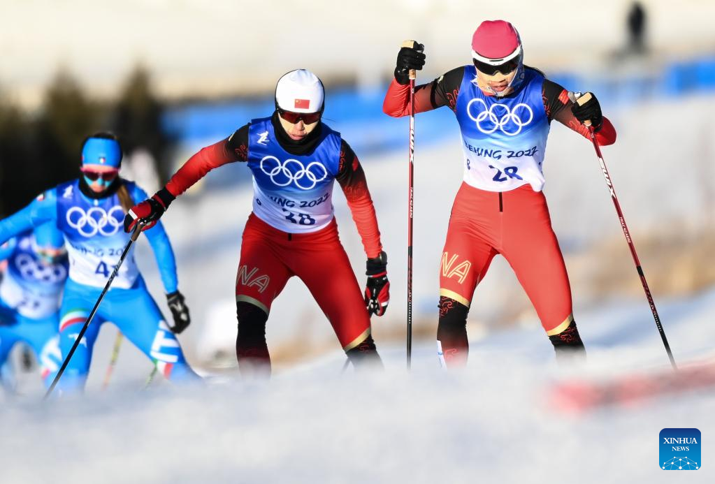 Li Xin (2nd R) of China competes during the Cross-Country Skiing Women's 7.5km + 7.5km Skiathlon at National Cross-Country Skiing Centre in Zhangjiakou, north China's Hebei Province, Feb. 5, 2022. (Xinhua/Zhang Hongxiang)