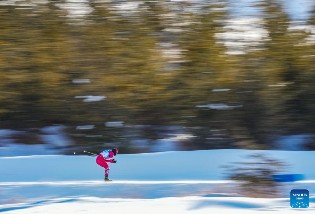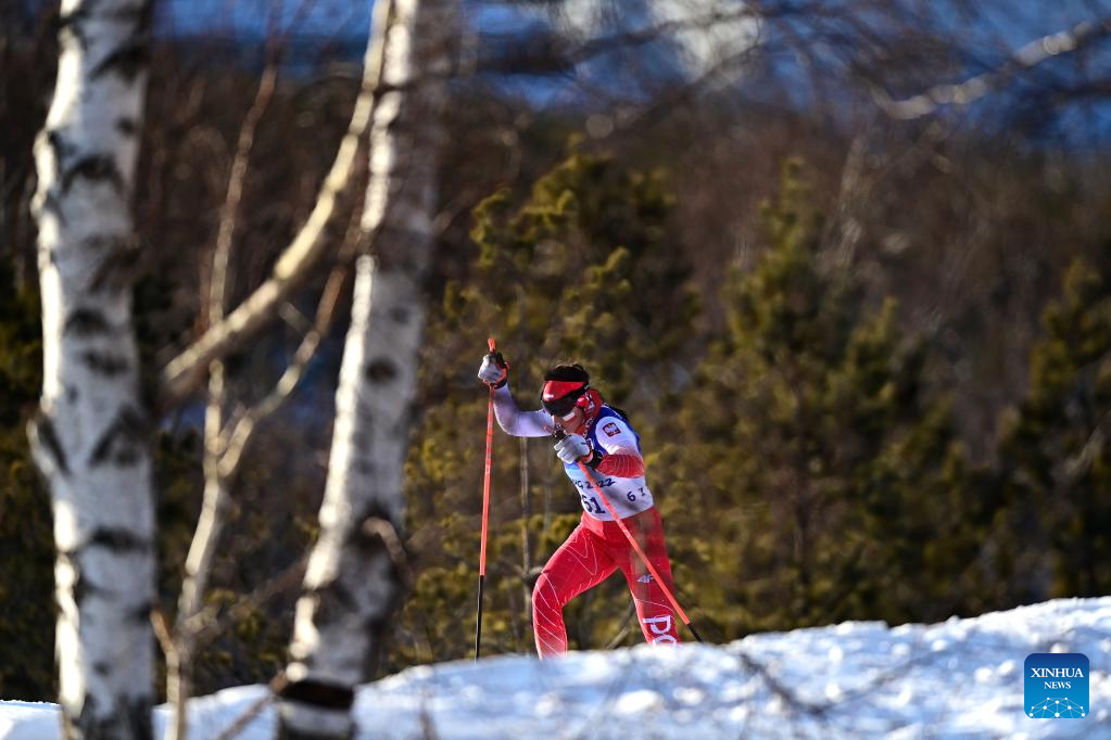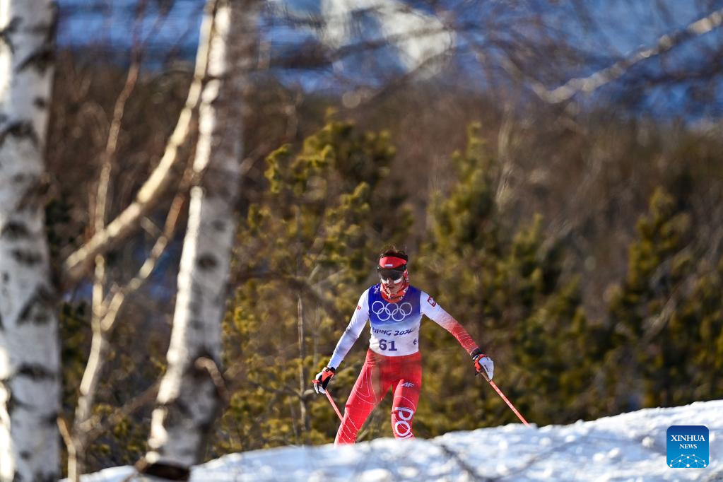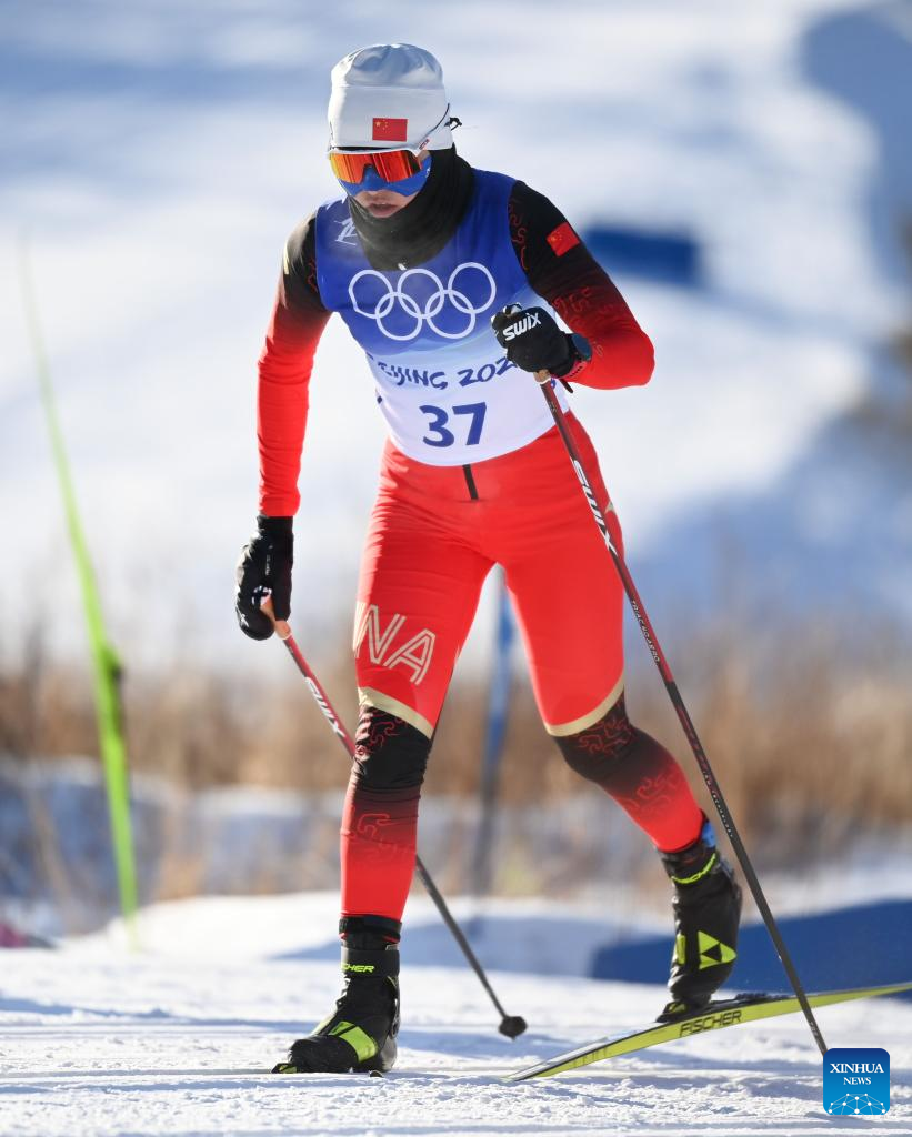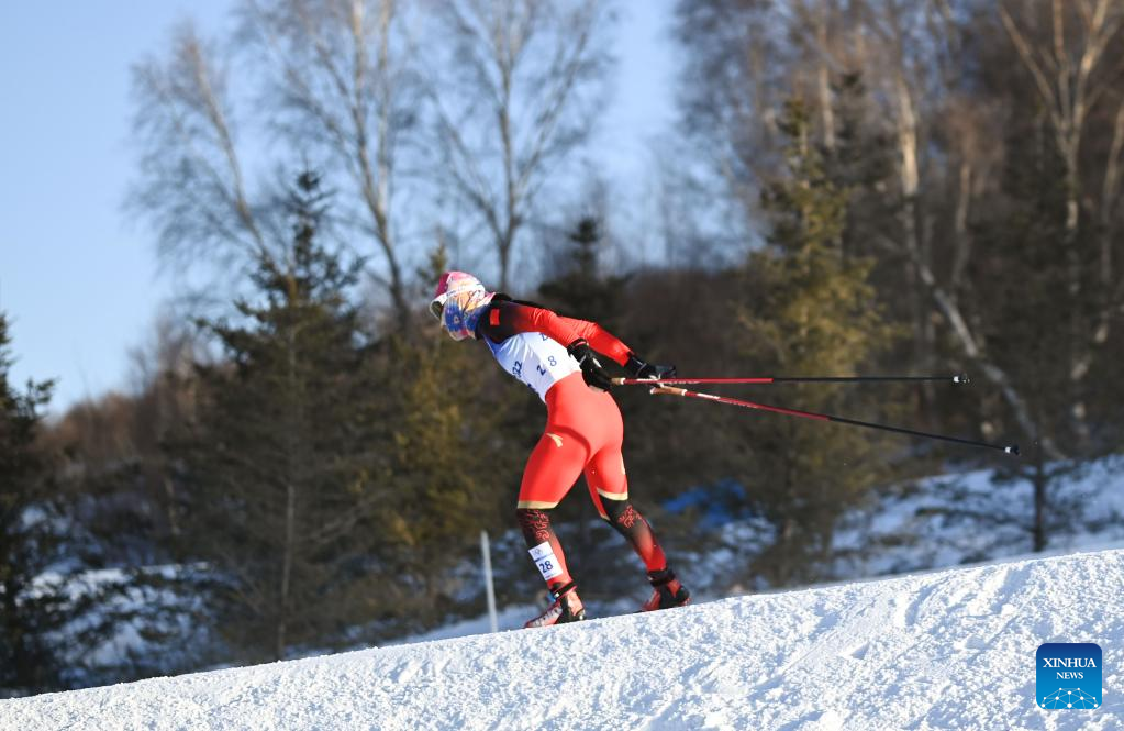 Bayani Jialin of China competes during the Cross-Country Skiing Women's 7.5km + 7.5km Skiathlon at National Cross-Country Skiing Centre in Zhangjiakou, north China's Hebei Province, Feb. 5, 2022. (Xinhua/Deng Hua)