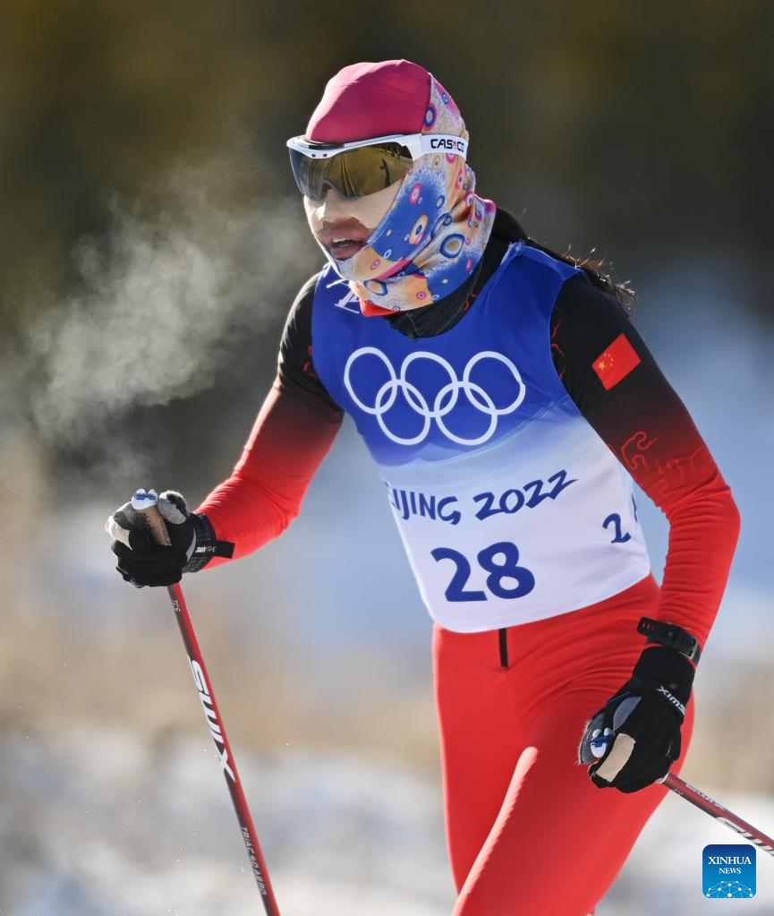 Chi Chunxue of China competes during the Cross-Country Skiing Women's 7.5km + 7.5km Skiathlon at National Cross-Country Skiing Centre in Zhangjiakou, north China's Hebei Province, Feb. 5, 2022. (Xinhua/Deng Hua)