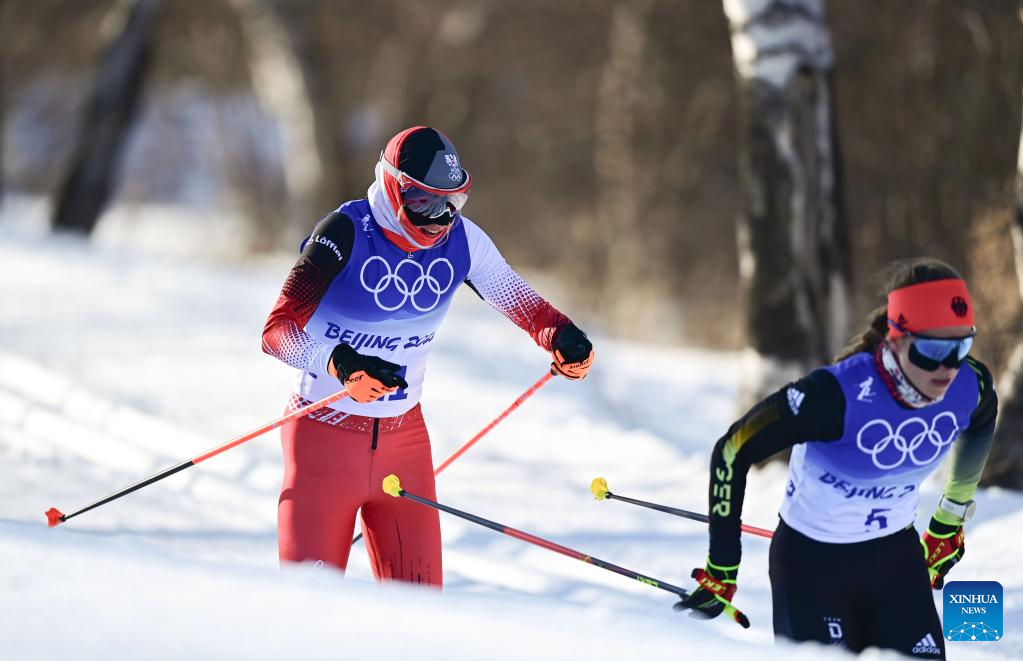 Teresa Stadlober (L) of Austria competes during the Cross-Country Skiing Women's 7.5km + 7.5km Skiathlon at National Cross-Country Skiing Centre in Zhangjiakou, north China's Hebei Province, Feb. 5, 2022. (Xinhua/Zhang Hongxiang)